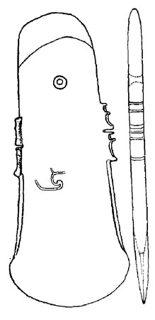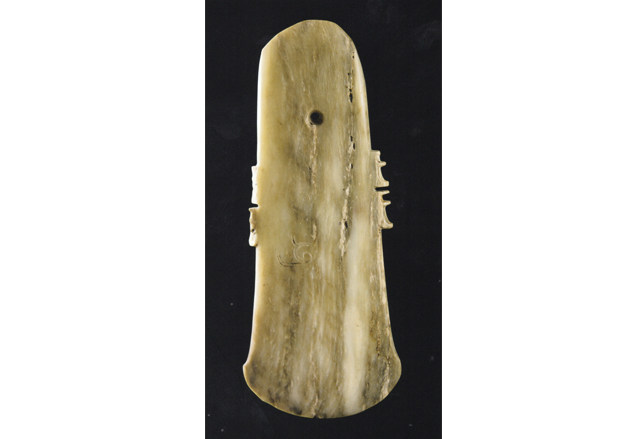 黄季佗父墓出土的这件玉钺,灰白色,体呈扁平长方形,上端窄,下端略宽并有圆弧刃,上、下刃中部有突棱,上突梭有磨损痕迹。器身一面光素,另一面饰一符号,器身两面饰有对称的齿牙,钺的上端有一单面钻孔。