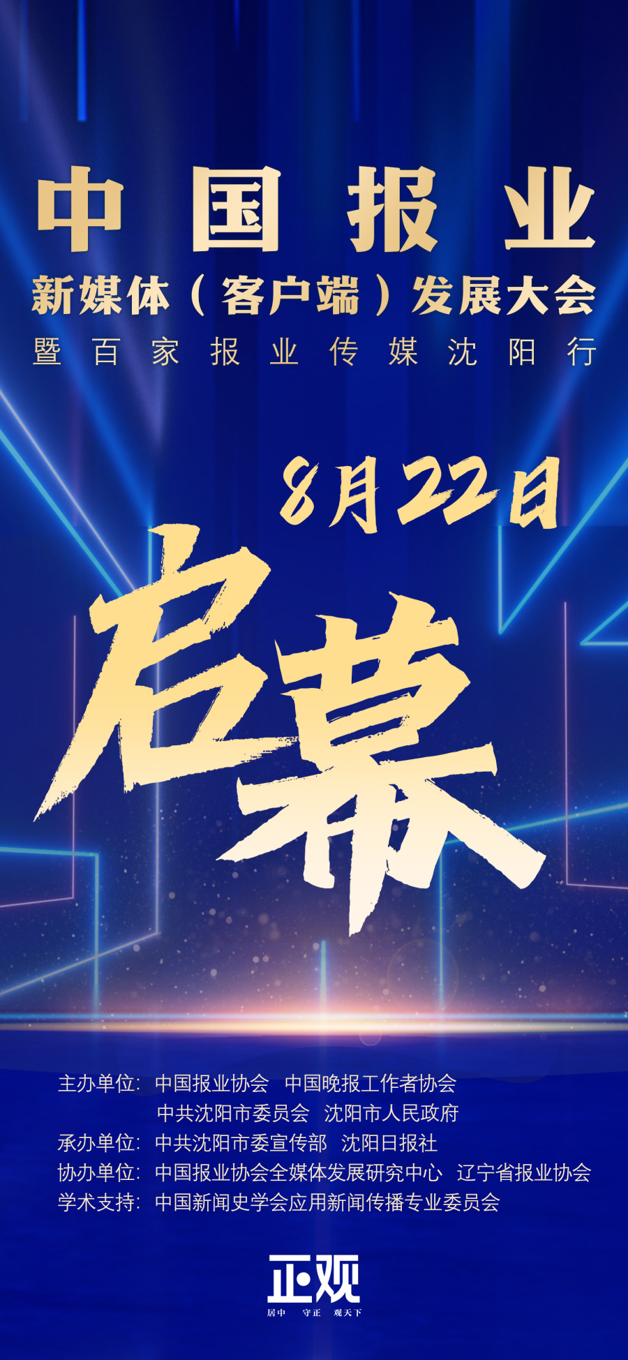 中国报业新媒体(客户端)发展大会暨百家报业传媒沈阳行调研活动将于8月22日至25日在辽宁沈阳正式启幕。全国150余家中央和省级、副省级及计划单列市、省会城市、部分地市报业集团社长、总编辑,及新媒体(客户端)分管领导将齐聚沈阳。大会将首次发布《中国报业新媒体(客户端)发展白皮书》,发布中国报业新媒体(客户端)影响力“沈阳指数”,并正式启动“中报全发”客户端矩阵传播平台合作体系。