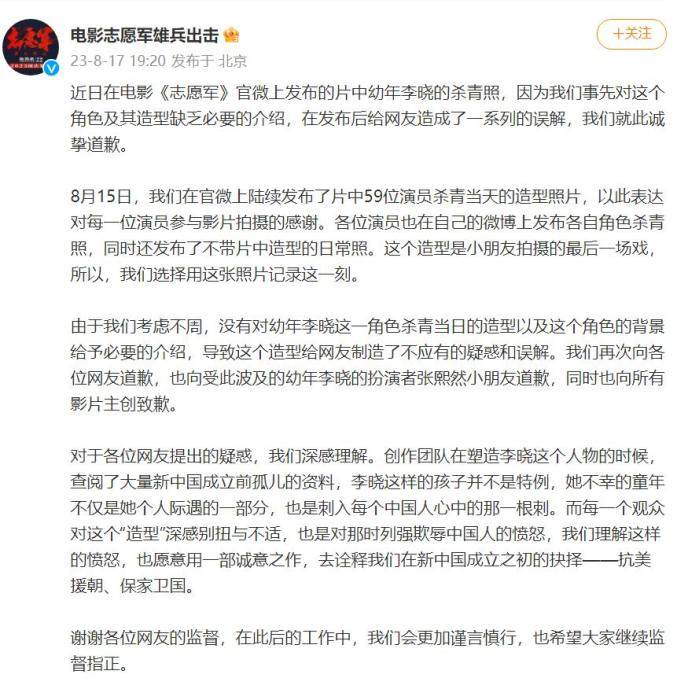 8月17日晚,@电影志愿军雄兵出击 发布致歉声明,近日在电影《志愿军》官微上发布的片中幼年李晓的杀青照,因为事先对这个角色及其造型缺乏必要的介绍,在发布后给网友造成了一系列的误解,就此诚挚道歉。