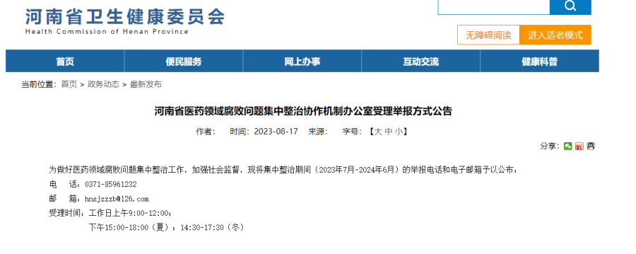 河南省医药领域腐败问题集中整治协作机制办公室受理举报方式公告
