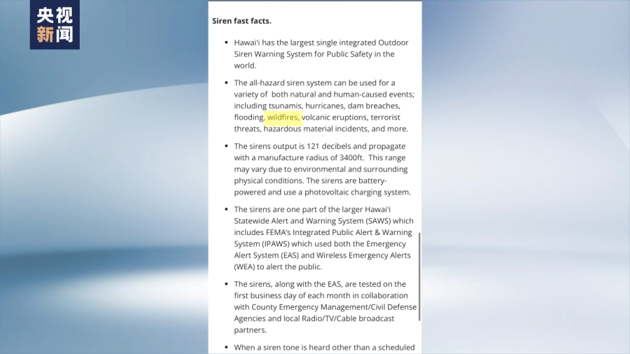 然而,在夏威夷州紧急事务管理部门的网站上,对警报系统用途的介绍中,火灾也赫然在列。