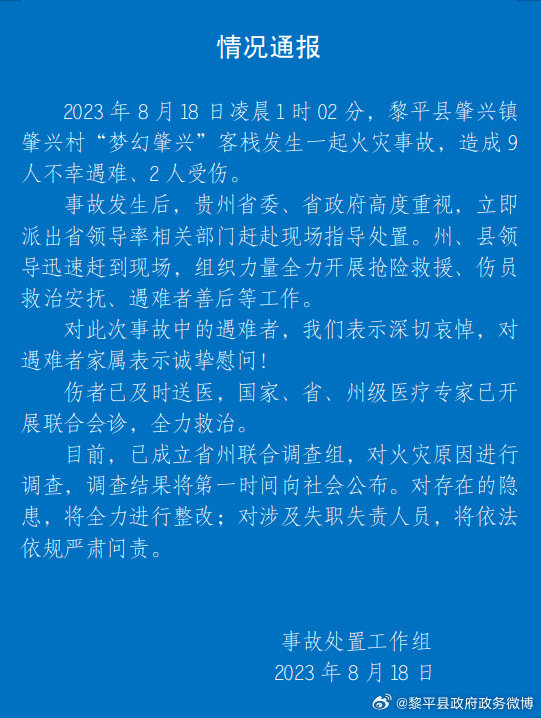 据@黎平县政府政务微博,8月18日凌晨1时02分,黎平县肇兴镇肇兴村“梦幻肇兴”客栈发生一起火灾事故,造成9人不幸遇难、2人受伤。