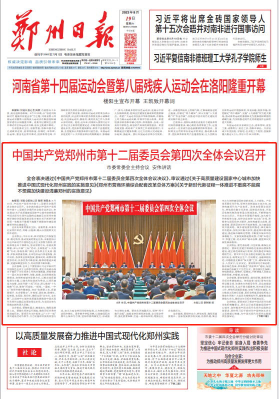 8月18日,中国共产党郑州市第十二届委员会第四次全体会议召开。全会表决通过《中国共产党郑州市第十二届委员会第四次全体会议决议》,审议通过《关于高质量建设国家中心城市加快推进中国式现代化郑州实践的实施意见》《郑州市营商环境综合配套改革总体方案》《关于新时代新征程一体推进不敢腐不能腐不想腐加快建设清廉郑州的实施意见》。