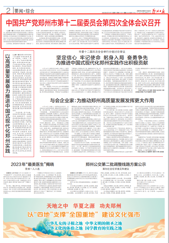 全会表决通过《中国共产党郑州市第十二届委员会第四次全体会议决议》,审议通过《关于高质量建设国家中心城市加快推进中国式现代化郑州实践的实施意见》《郑州市营商环境综合配套改革总体方案》《关于新时代新征程一体推进不敢腐不能腐不想腐加快建设清廉郑州的实施意见》。