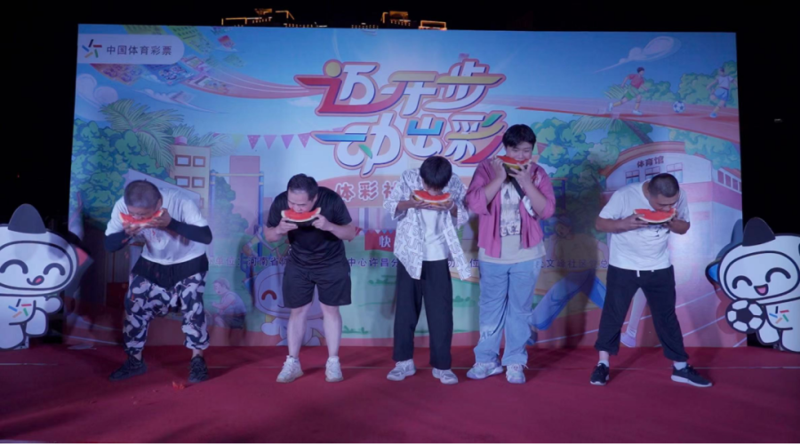 晚上八点半,在许昌市首场社区运动会上,精彩的二人转表演赢得了现场观众的阵阵掌声,人们一边看演出一边玩游戏,累了还能在现场买几张顶呱刮,试试运气。