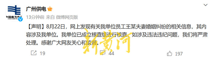 22日晚,广州供电局@广州供电 发布声明:8月22日,网上发现有关我单位员工王某夫妻婚姻纠纷的相关信息,其内容涉及我单位。我单位已成立核查组进行核查,如涉及违法违纪问题,我们将严肃处理。感谢广大网友关心和监督。