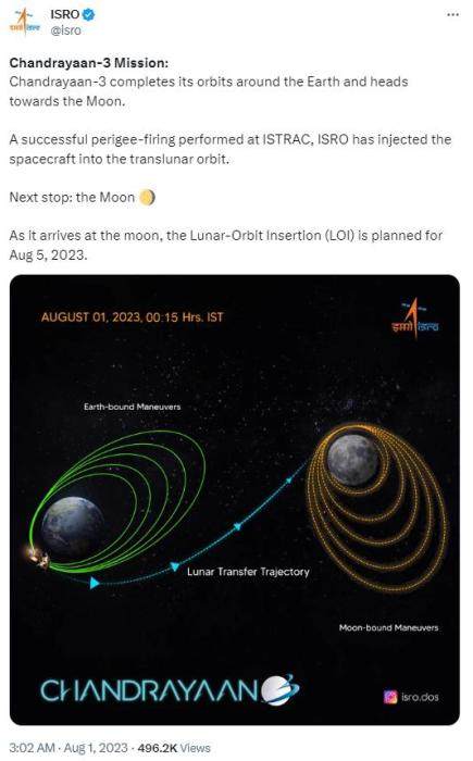 当地时间8月1日,印度空间研究组织(ISRO)在社交媒体上发文称,该国的月球探测器“月船三号”进入近月轨道。图片来源:ISRO社交账号截图