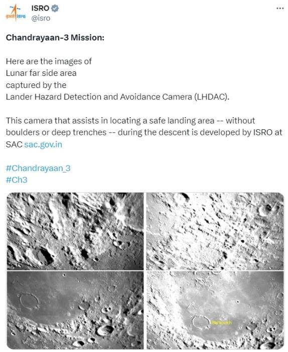 8月21日,ISRO在社交媒体上发布了“月船3号”上的LHDAC相机(着陆器危险探测与规避相机)拍摄的月球表面图像。图像中,鲜明展现了月球暗面海因环形山、博斯环形山、别利科维奇环形山和洪堡海等特征。