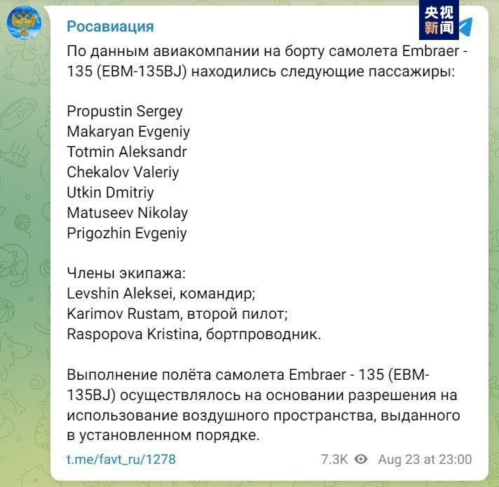 据俄罗斯联邦航空运输署发布的失事飞机上的人员名单显示,7名乘客中包括瓦格纳集团的几乎所有高层领导。