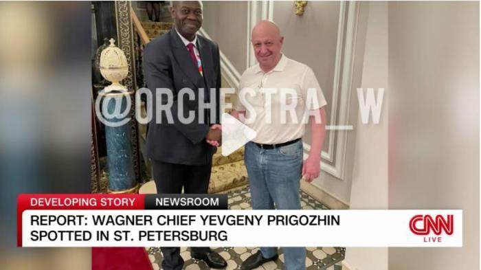 在圣彼得堡举行的俄非峰会期间,“瓦格纳”组织创始人普里戈任被拍到和与会非洲代表握手。(图片来源:美国有线电视新闻网视频截图)