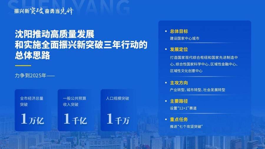 沈阳现代化都市圈是东北地区第1个国家级现代化都市圈,正全力打造国家新型工业化示范区、东北振兴重要增长极。在全面提升城乡品质上,沈阳以城市更新“五大行动”“五工程一管理”、核心发展板块建设为抓手,全力打造现代化、生态化、国际化大都市。