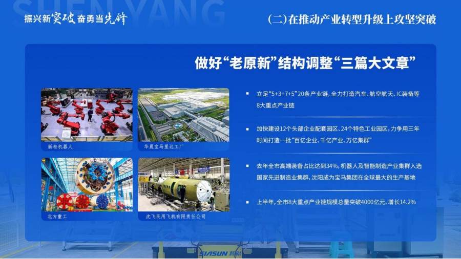 作为“共和国长子”,沈阳市坚持把发展经济的着力点放在实体经济上,做大做强优势产业,加快建设数字沈阳、智造强市,推出更多体现中国速度、中国水平的“沈阳制造”,为国家产业链供应链自主可控和安全可靠展现沈阳担当。