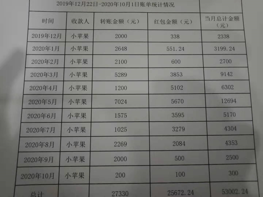 他打印了自己和“小苹果”之间的转账记录和聊天截图,还整理了这一年多以来跟“小苹果”所有的金钱往来流水,足足154页。他决定去报警。在报警前不久,他还曾大手笔地一次性给对方转账5000元,那是他将近两个月的工资。