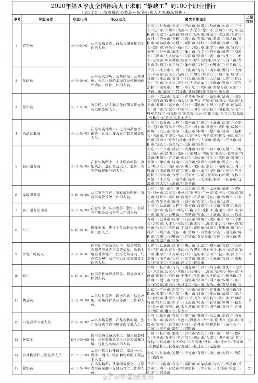 1月26日,人社部发布2020年第四季度全国招聘大于求职“最缺工”的100个职业排行。营销员、保洁员、保安员、商品营业员、餐厅服务员、家政服务员、客服、车工、房地产经纪、焊工排名前十。排行前十职业基本保持稳定,本期焊工进入前十,快递员退出前十。