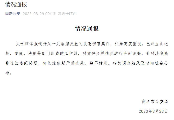 商洛市公安局8月29日凌晨发布情况通报:关于媒体报道丹凤一足浴店发生的故意伤害案件,我局高度重视,已成立由纪检、督察、法制等部门组成的工作组,对案件办理情况进行全面调查,针对涉案民警违法违纪问题,将依法依纪严肃查处,绝不姑息。相关调查结果及时向社会公布。