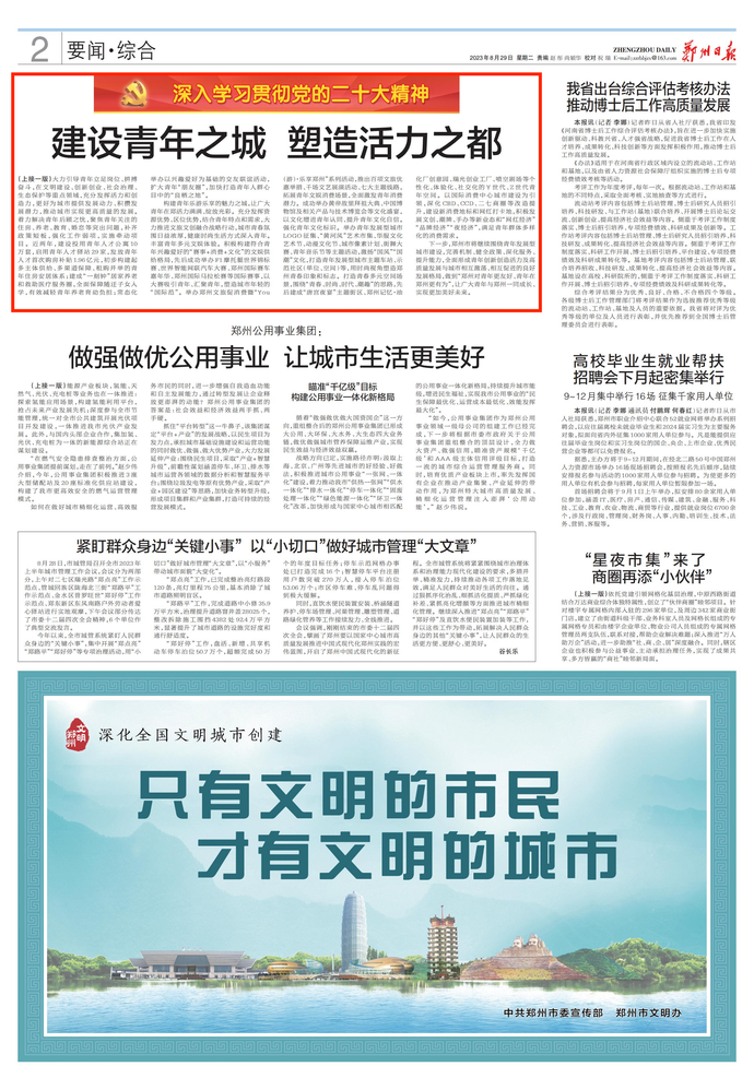 编者按 昨日,《中国青年报》在1版刊发省委常委、市委书记安伟署名文章《建设青年之城 塑造活力之都》。文章说:郑州市深入贯彻党的二十大精神和习近平总书记关于青年工作的重要思想,着力实现广大青年与郑州国家中心城市现代化建设双向奔赴、同频共振、互融提升,全面构建“活力郑州、青春郑州”。文章从坚持和加强党对青年工作的领导、打造青年创新创业的理想之城、建设青年宜居幸福的友好之城、构建青年乐游乐享的魅力之城等方面,详细介绍了郑州建设青年之城、塑造活力之都的生动实践。本报今日全文转载。