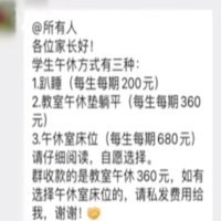 据九派新闻报道,东莞一学校的一个微信群里,有老师告知家长,学生午休方式有三种:趴睡、午休垫躺平以及午休室床位,其中趴睡最便宜,每期200元。请家长自愿选择。