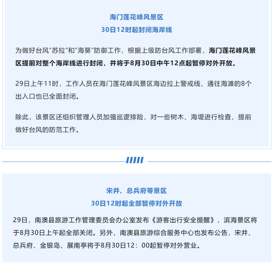 截止至8月30日14点,广州南沙天后宫景区自2023年8月30日中午12:00起暂时闭园;南沙湿地景区自2023年8月30日中午12:00起暂时闭园。具体恢复开放时间,视天气情况另行通知。