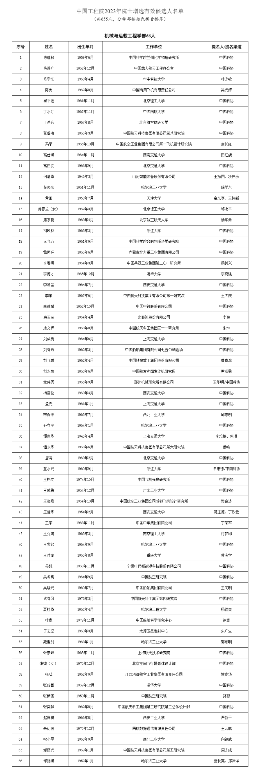 经中国工程院第八届主席团第六次会议审议,中国工程院党组审定,确认中国工程院2023年院士增选有效候选人655人。