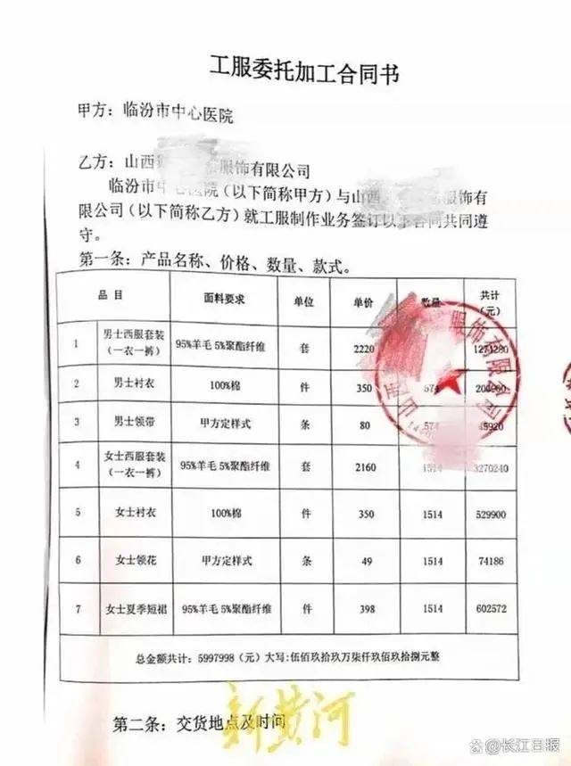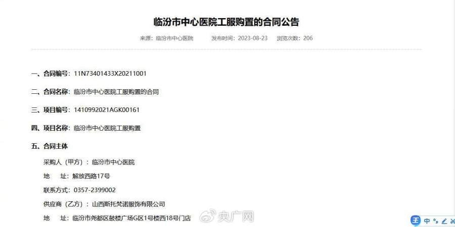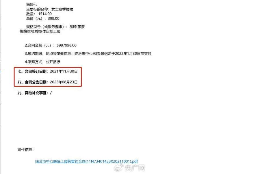 记者在山西省政府采购网查询发现,2023年8月23日该网发布了临汾市中心医院工服购置的合同公告,根据公告内容及附件信息显示,工服购置合同的签订时间为2021年11月30日。