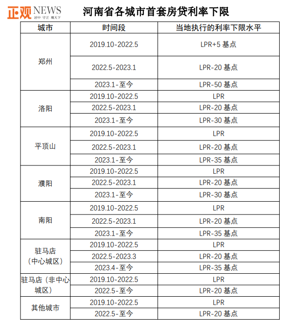 据公告消息,为确保存量房贷利率调整顺利落地,人民银行河南省分行向社会公众公布改革完善贷款市场报价利率(LPR) (2019 年 10 月(含))以来河南省各城市首套房贷利率下限(见下表),同时提供了相应阶段全国首套房贷利率政策下限,供参考。