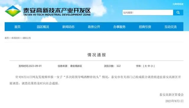 9月1日下午,泰安高新区管委会发布消息:针对8月31日网友发视频举报一女子“多次陪领导喝酒醉卧街头”情况,泰安市有关部门已组成联合调查组进驻泰安高新区开展调查,调查结果将及时向社会通报。