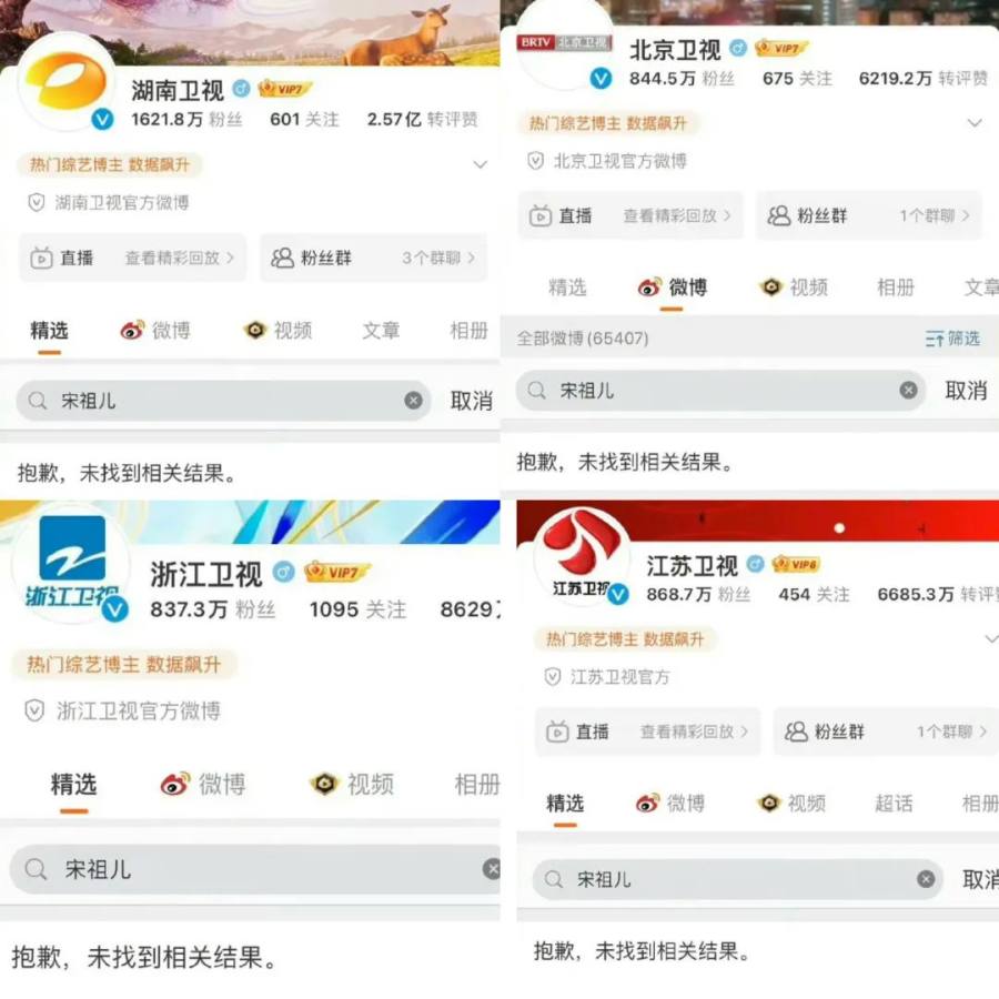 经查询,在包括湖南、北京、浙江、江苏、安徽等各大卫视官方微博主页中搜索“宋祖儿”,都显示“未找到相关结果”。