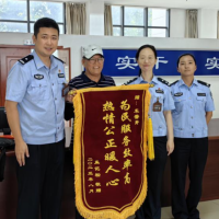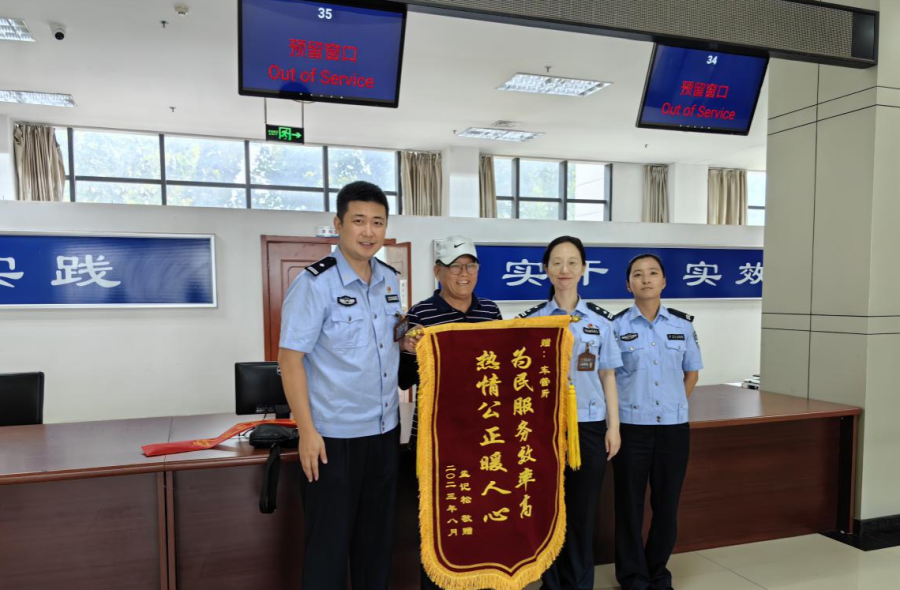 9月1日上午,一名群众送来锦旗,上面写着“为民服务效率高,热情公正暖人心”几个金光闪闪的大字。