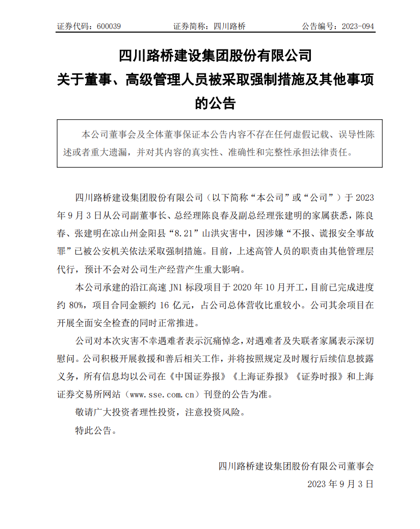 四川路桥9月3日公告,公司于2023年9月3日从公司副董事长、总经理陈良春及副总经理张建明的家属获悉,陈良春、张建明在凉山州金阳县“8.21”山洪灾害中,因涉嫌“不报、谎报安全事故罪”已被公安机关依法采取强制措施。目前,上述高管人员的职责由其他管理层代行,预计不会对公司生产经营产生重大影响。