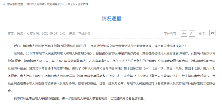 经调查,2017年旬阳市人民医院制定《聘用人员管理办法》,依据该办法“除从事临床医疗岗位,其他各岗位聘用人员男性满50周岁,女性满44周岁不再续聘”规定,解除聘用人员19人,其中2022年以前解聘15人,2023年解聘4人,存在未依法与符合条件的劳动者订立无固定期限劳动合同、违法解除劳动合同及经济补偿金计算方式不符合法律规定等问题,违反了《中华人民共和国劳动合同法》第十四条二款(一)(三)项、第三十九条、第四十七条、第八十七条规定。市人社局于9月1日向旬阳市人民医院送达《劳动保障监察限期改正指令书》,责令其15日内修订《聘用人员管理办法》,经主管局审定后执行。市联合调查组责令市人民医院与被解聘人员充分协商、依法予以赔偿。目前,经双方协商,旬阳市人民医院已向19名被解聘人员支付经济补偿标准的二倍赔偿金。