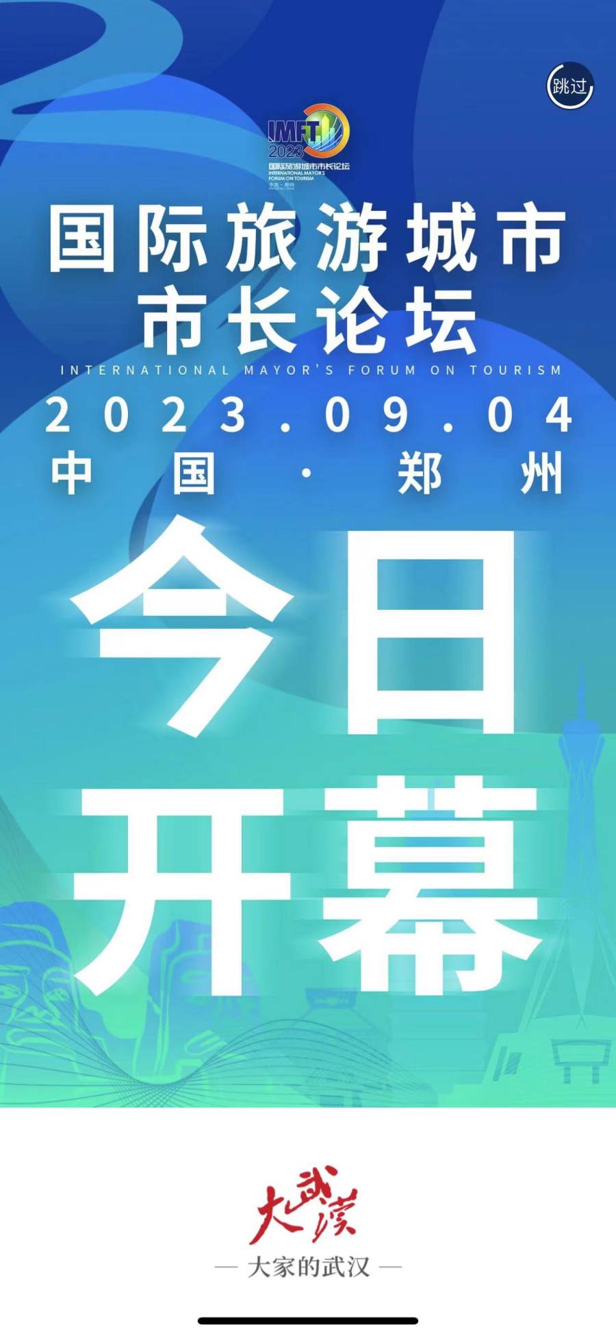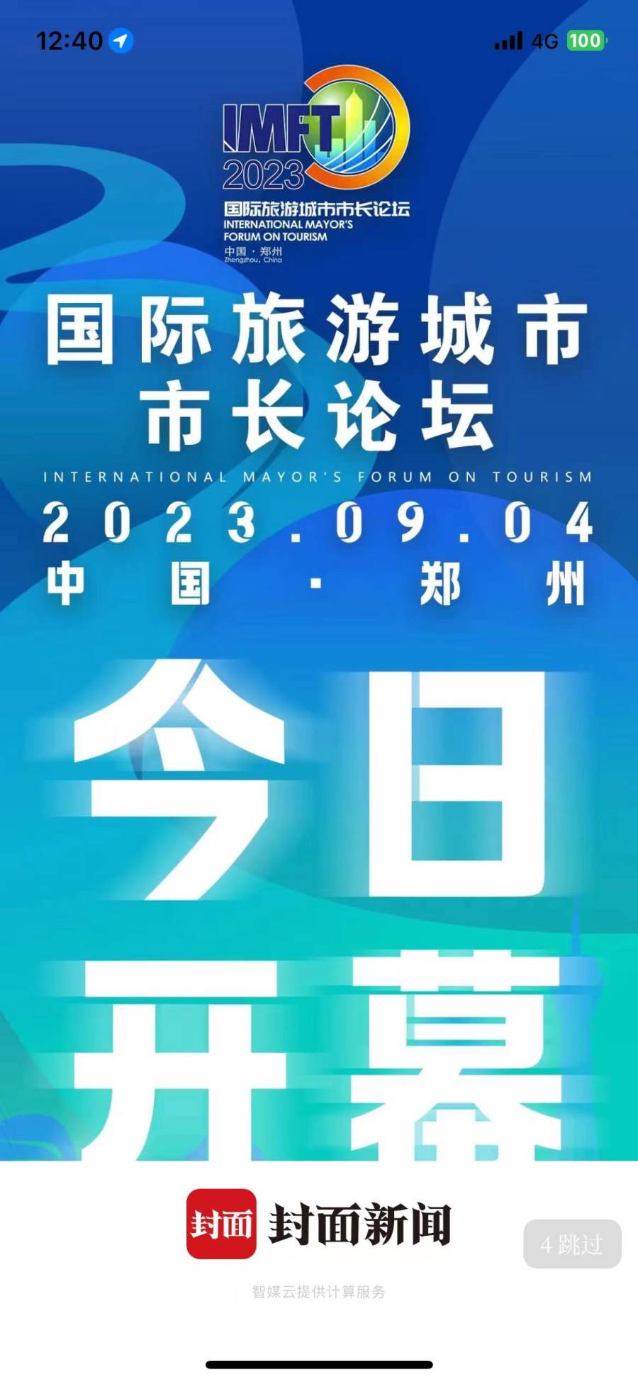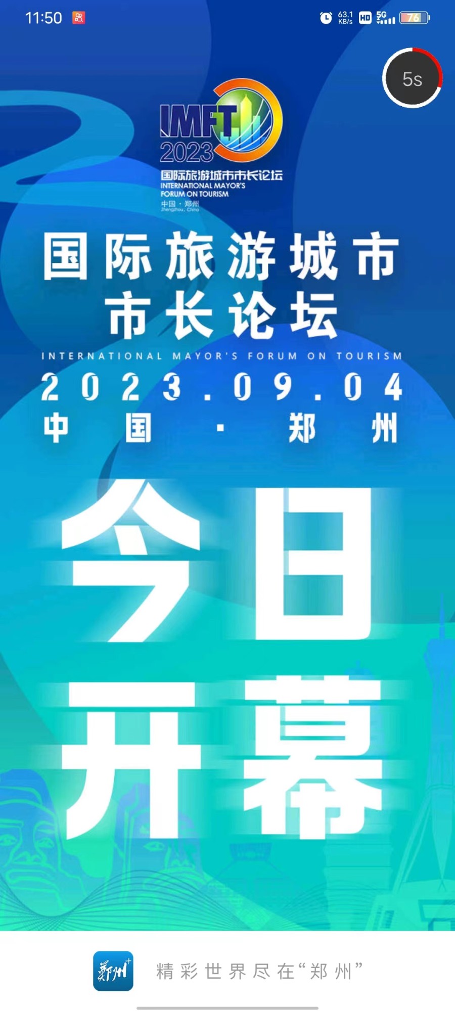 9月4日上午,2023中国(郑州)国际旅游城市市长论坛在郑州国际会展中心开幕,全国多家受邀城市主流媒体APP开屏展示,送来祝福。