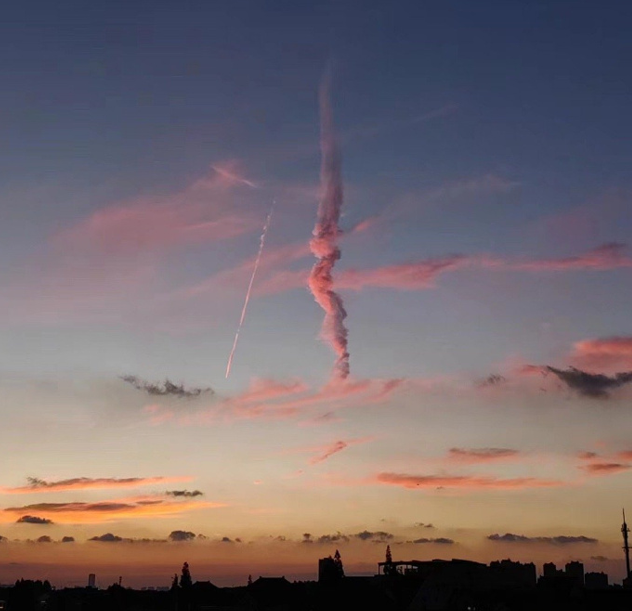 当天傍晚,上海网友又拍下粉色天空中疑似有燃烧的不明飞行物垂直而下。