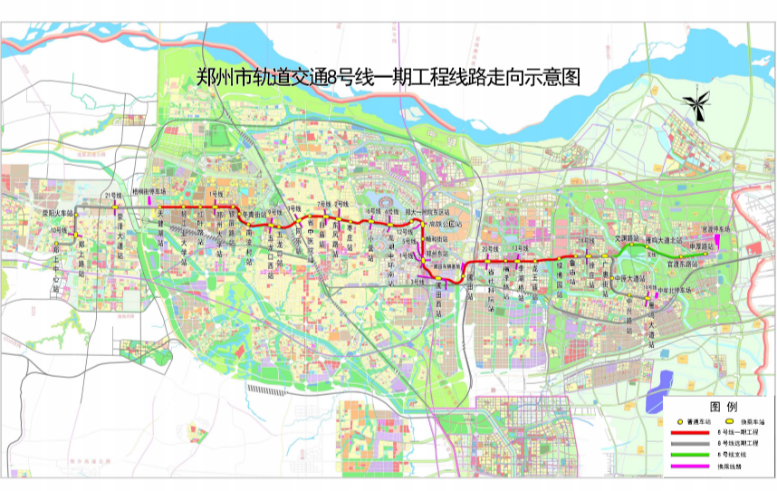 郑州市轨道交通8号线一期工程起于绕城高速公路东侧的天健湖站,终点位于中牟组团的文创站。8号线一期工程线路长51.78km,设站28座。根据相关施工公示,8号线一期竣工日期为2024年12月31日。