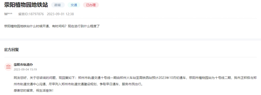 9月4日,荥阳市轨道办回复:郑州市轨道交通十号线一期由郑州火车站至高铁西站预计2023年10月初通车,荥阳市植物园站为十号线二期,我市正积极与郑州市轨道交通中心沟通,尽早列入郑州市轨道交通建设规划,争取早日通车,服务市民出行。