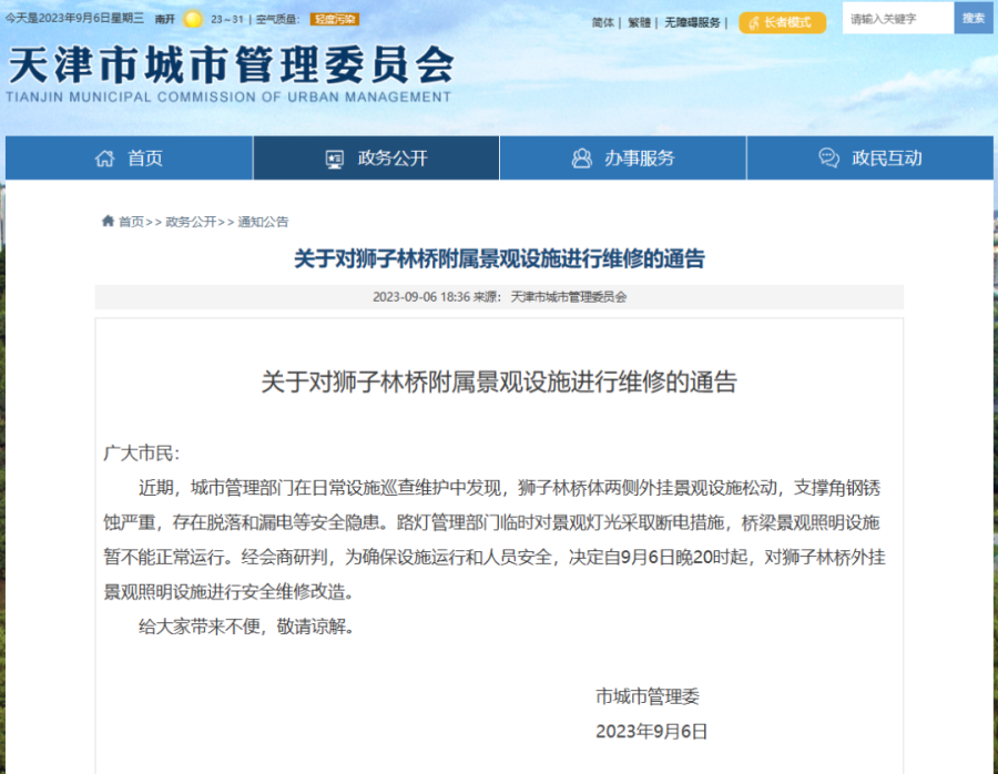 9月6日晚,天津市城市管理委员会发布“关于对狮子林桥附属景观设施进行维修的通告”。