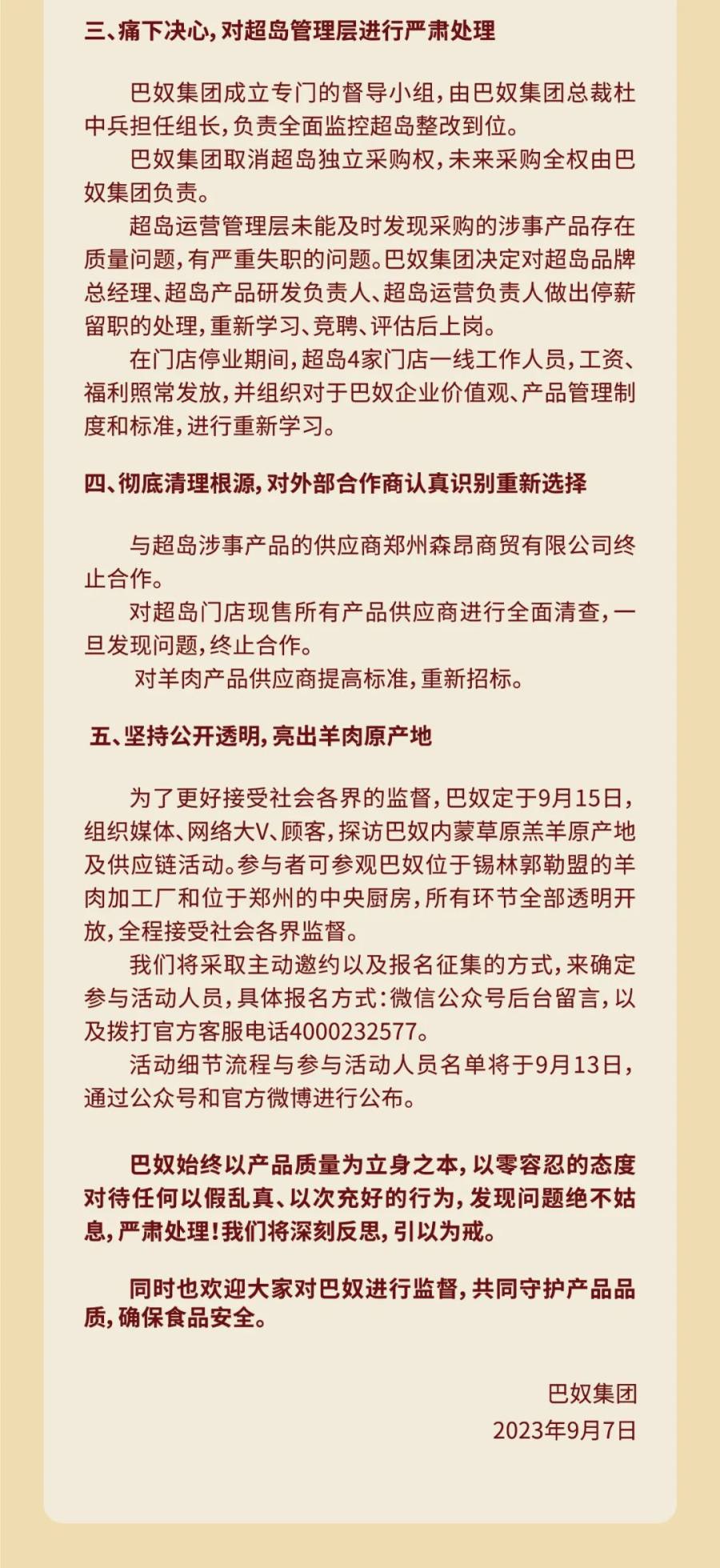针对此事,9月6日,巴奴毛肚火锅微信公众号发布声明称:超岛确实为巴奴集团旗下子品牌,虽然其创立以来由独立团队运营,但巴奴集团对超岛有不可推卸的监督管理责任。