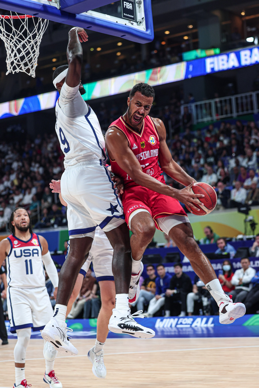 终场前4分42秒,96:106落后的美国队叫了暂停。暂停之后,里维斯的三分球、爱德华兹的罚球和三分球把比分追成103:106。不久之后,里维斯两罚两中,比分变成107:108。关键时刻,奥布斯特投中三分球,施罗德急停跳投得手,终场前40秒德国队以113:107领先。