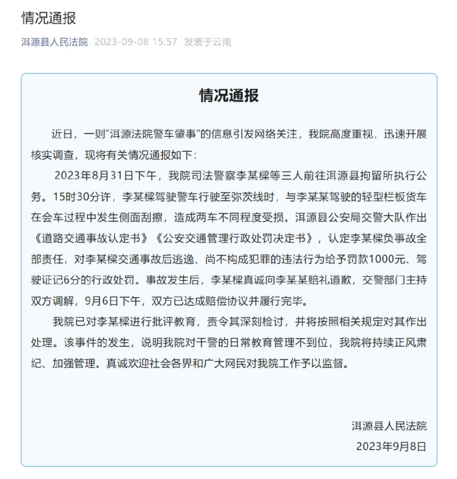 8日下午,洱源县人民法院发布情况通报称交警部门认定李某樑负事故全部责任,对李某樑交通事故后逃逸、尚不构成犯罪的违法行为给予罚款1000元、驾驶证记6分的行政处罚。