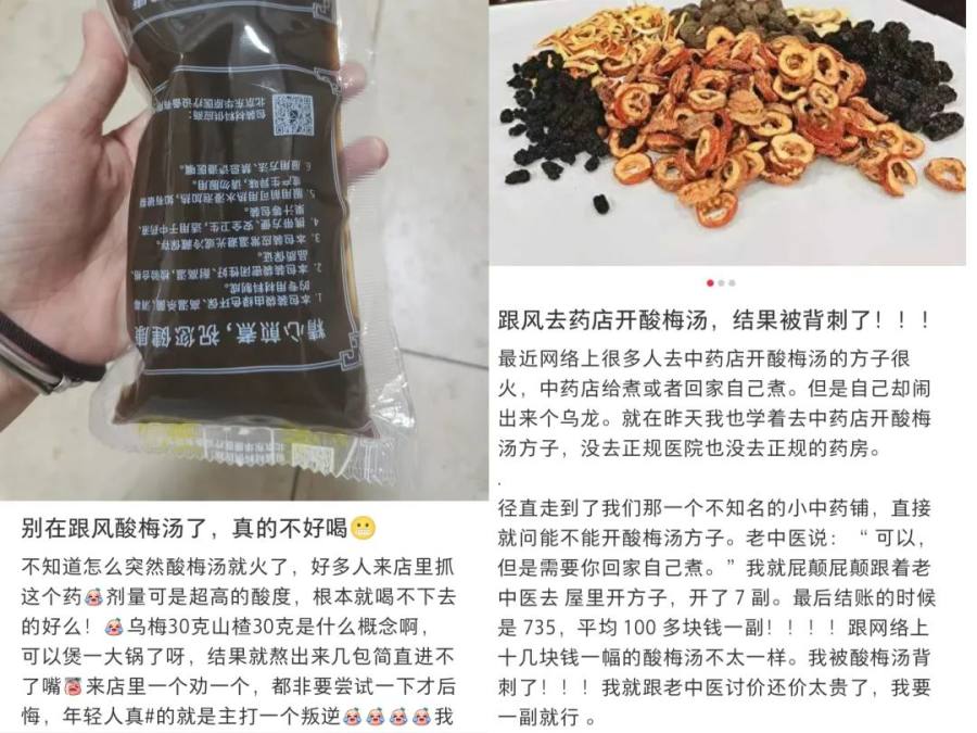 在社交平台上,不少网友表示自己在跟风尝试后选择了“避雷”:“实在太酸了,中药味也很浓,应该是煎锅已经被中药渗透入味了。”“药房不提供冰糖,需要自备。”“还是别盲目跟风,就味道而言,中药是不可能打败奶茶的,就是健康而已。”