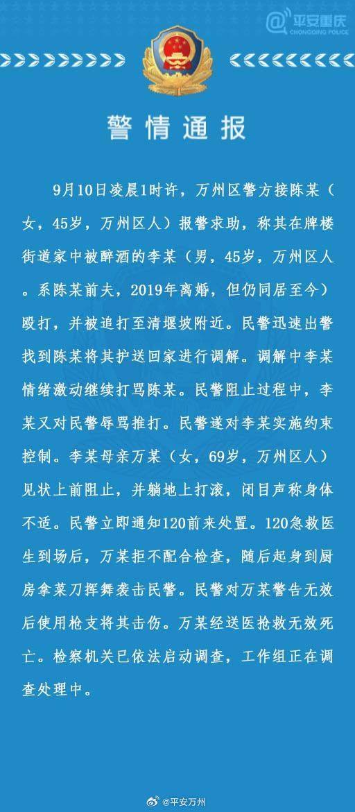 9月10日凌晨1时许,万州区警方接陈某 (女,45岁,万州区人) 报警求助,称其在牌楼街道家中被醉酒的李某(男,45岁,万州区人。系陈某前夫,2019年离婚,但仍同居至今)殴打,并被追打至青岩坡附近。民警迅速出警找到陈某将其护送回家进行调解。调解中李某情绪激动继续打骂陈某。民警阻止过程中,李某又对民警辱骂推打。民警遂对李某实施约束控制。李某母亲万某 (女,69岁,万州区人)见状上前阻止,并躺地上打滚,闭目声称身体不适。民警立即通知120前来处置。120急救医生到场后,万某拒不配合检查,随后起身到厨房拿菜刀挥舞袭击民警。民警对万某警告无效后使用枪支将其击伤。万某经送医抢救无效死亡。检察机关已依法启动调查,工作组正在调查处理中。