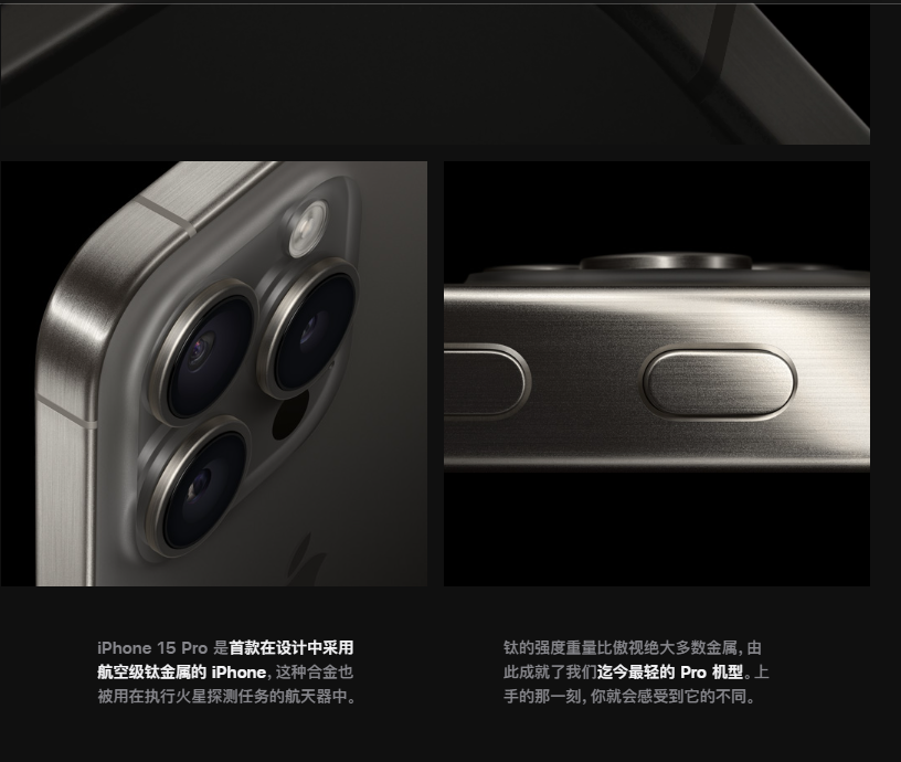 接下来苹果发布高端机型iPhone 15 Pro,苹果表示,iPhone 15 Pro 是首款在设计中采用航空级钛金属的 iPhone,这种合金也被用在执行火星探测任务的航天器中。钛的强度重量比傲视绝大多数金属,由此成就了我们迄今最轻的 Pro 机型。上手的那一刻,你就会感受到它的不同。