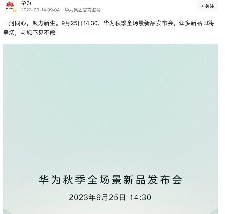 9月14日上午,华为在官方多个社交账号发布消息,称将在9月25日下午2:30举行华为秋季全场景新品发布会。华为内部人士向第一财经记者确认了上述发布会包含了手机新品的发布信息。