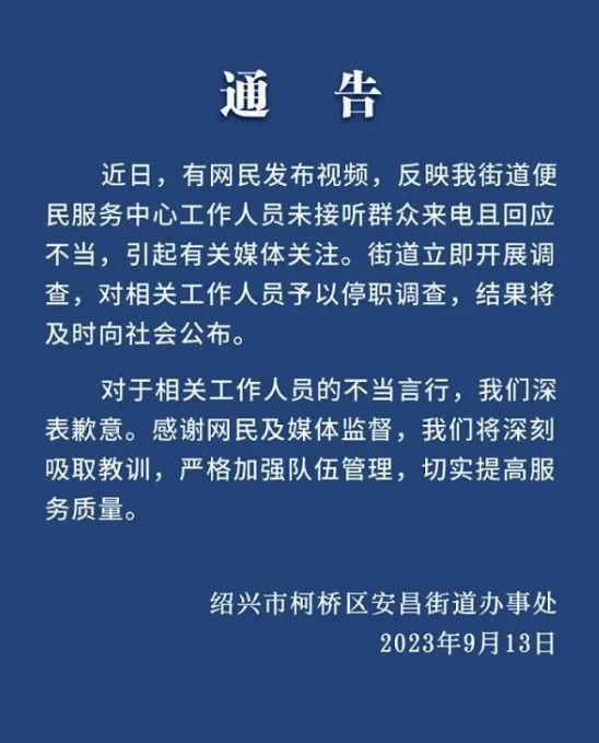 13日,绍兴市柯桥区安昌街道办事处发布通报:对相关工作人员予以停职调查;对于相关工作人员的不当言行,我们深表歉意。