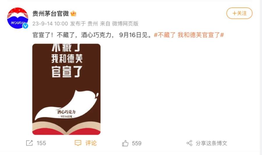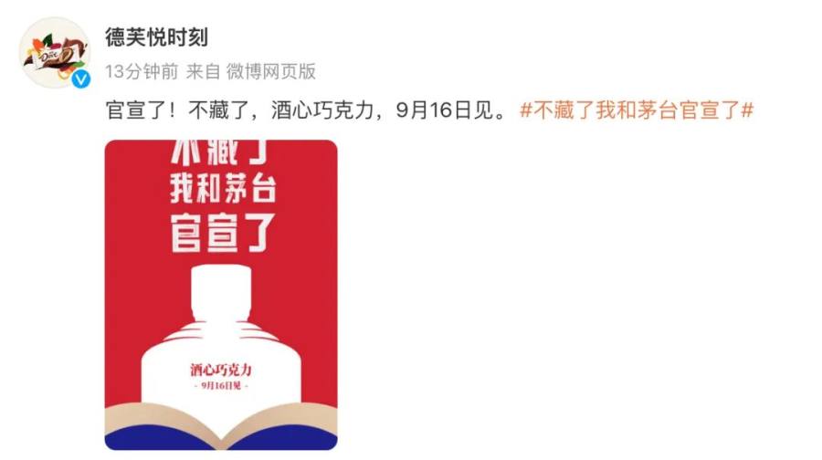 9月14日,贵州茅台在其官方微博官宣称,9月16日将与德芙合作推出酒心巧克力。该消息一出,引发网友热议:“高低得尝尝53度的酒心”“原以为躲过了咖啡,没想到躲不过巧克力,属实是被拿捏了。”还有网友喊话德芙巧克力竞品的,“德芙:费,我已嫁入豪门。”