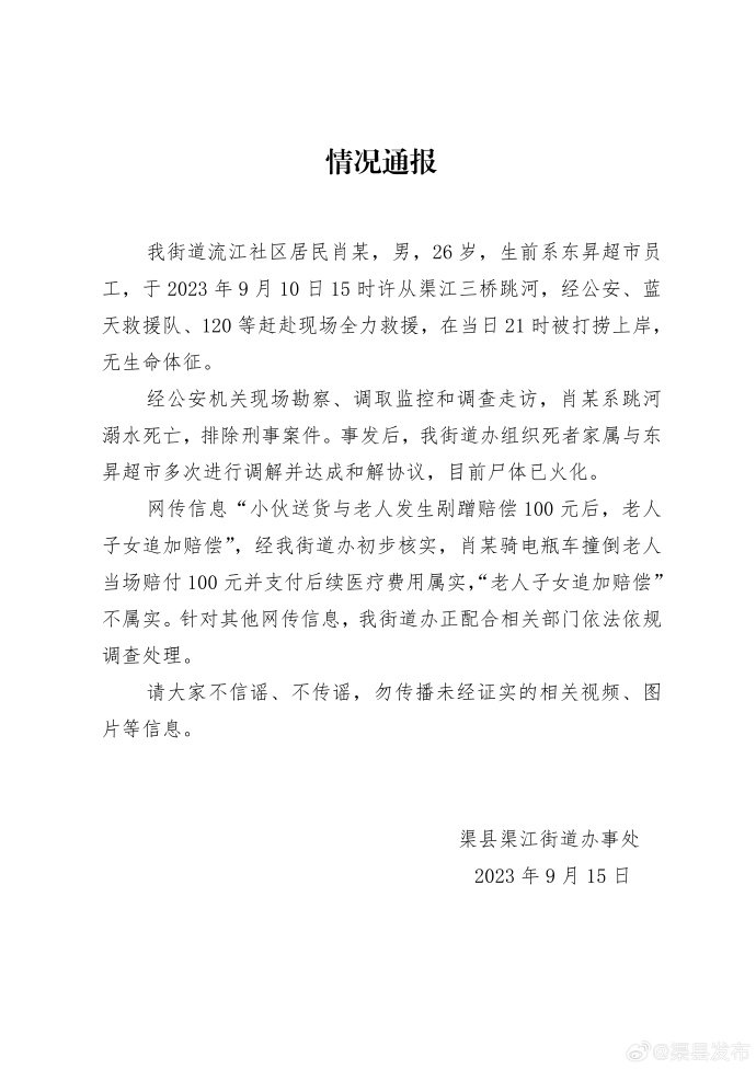 9月15日,四川渠县渠江街道办事处发布情况通报:我街道流江社区居民肖某,男,26岁,生前系东异超市员工,于2023年9月10日15时许从渠江三桥跳河,经公安、蓝天救援队、120等赶赴现场全力救援,在当日21时被打捞上岸,无生命体征。
