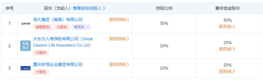 天眼查查询显示,许家印的恒大集团通过旗下公司共持有恒大人寿50%的股份。