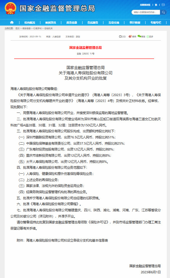 国家金融监督管理总局官网信息显示,2023年4月24日,原中国银保监会批复同意筹建海港人寿保险股份有限公司。2023年6月1日,国家金融监督管理总局批复同意海港人寿保险股份有限公司开业。