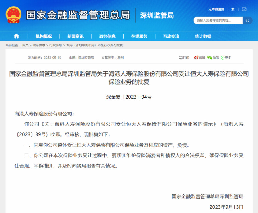 据国家金融监督管理总局官网消息,日前,国家金融监督管理总局深圳监管局批复同意海港人寿保险股份有限公司整体受让恒大人寿保险有限公司保险业务及相应的资产、负债。