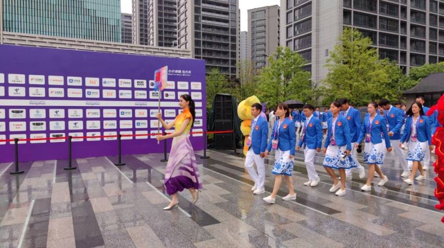 杭州第19届亚运会亚运村开村仪式暨中国体育代表团欢迎仪式16日在杭州亚运村旗帜广场举行。