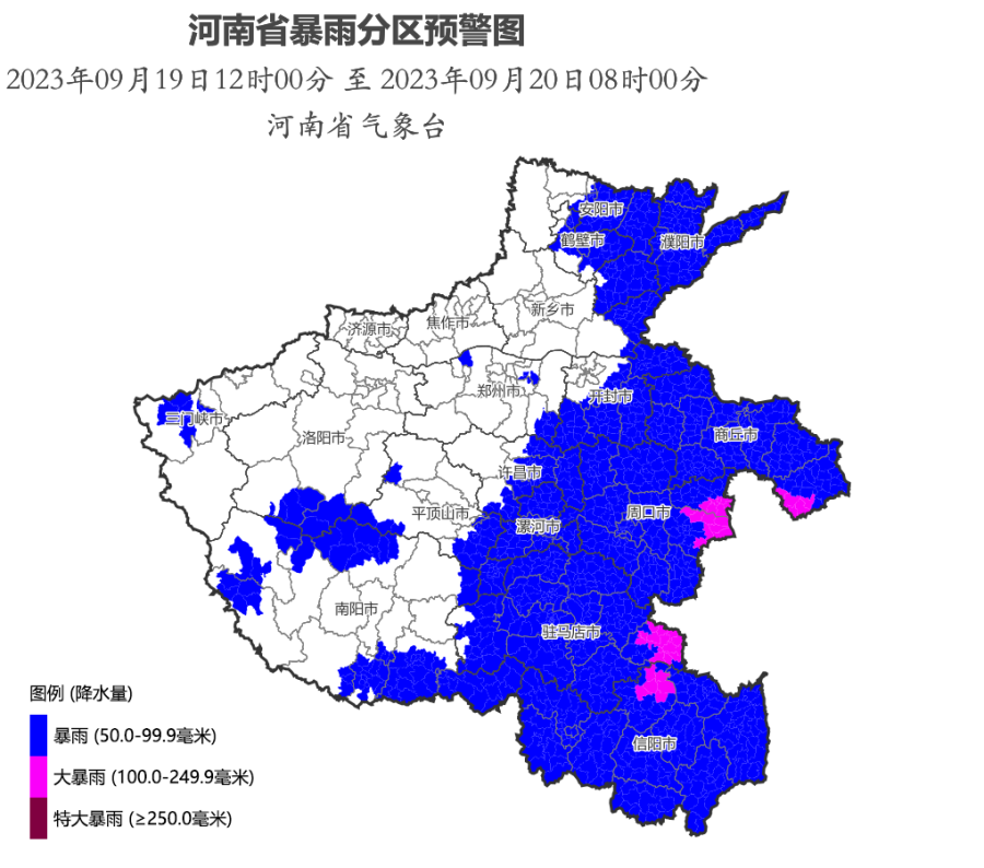 河南省气象台9月19日12时升级发布暴雨黄色预警:9月18日12时至19日12时,安阳、新乡、济源、三门峡、平顶山、周口、南阳、驻马店、信阳部分县市出现暴雨,其中驻马店、信阳、安阳局部出现大暴雨;预计19日12时到20日08时,上述县市(区)和濮阳、鹤壁、开封、商丘、许昌、漯河、洛阳南部仍将出现暴雨,其中商丘东部、周口东部、驻马店东部、信阳东部局部将出现大暴雨(100到130毫米,个别站点150毫米左右),强降雨时伴有雷电、短时强降水(最大小时降水量40到70毫米)、短时大风(8到10级)等强对流天气。请密切关注属地气象部门发布的最新预报信息和气象灾害预警信号,做好防范应对工作。上述地区的相邻县市(区)也需关注。
